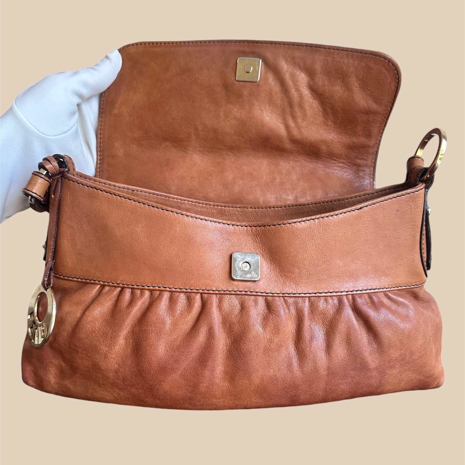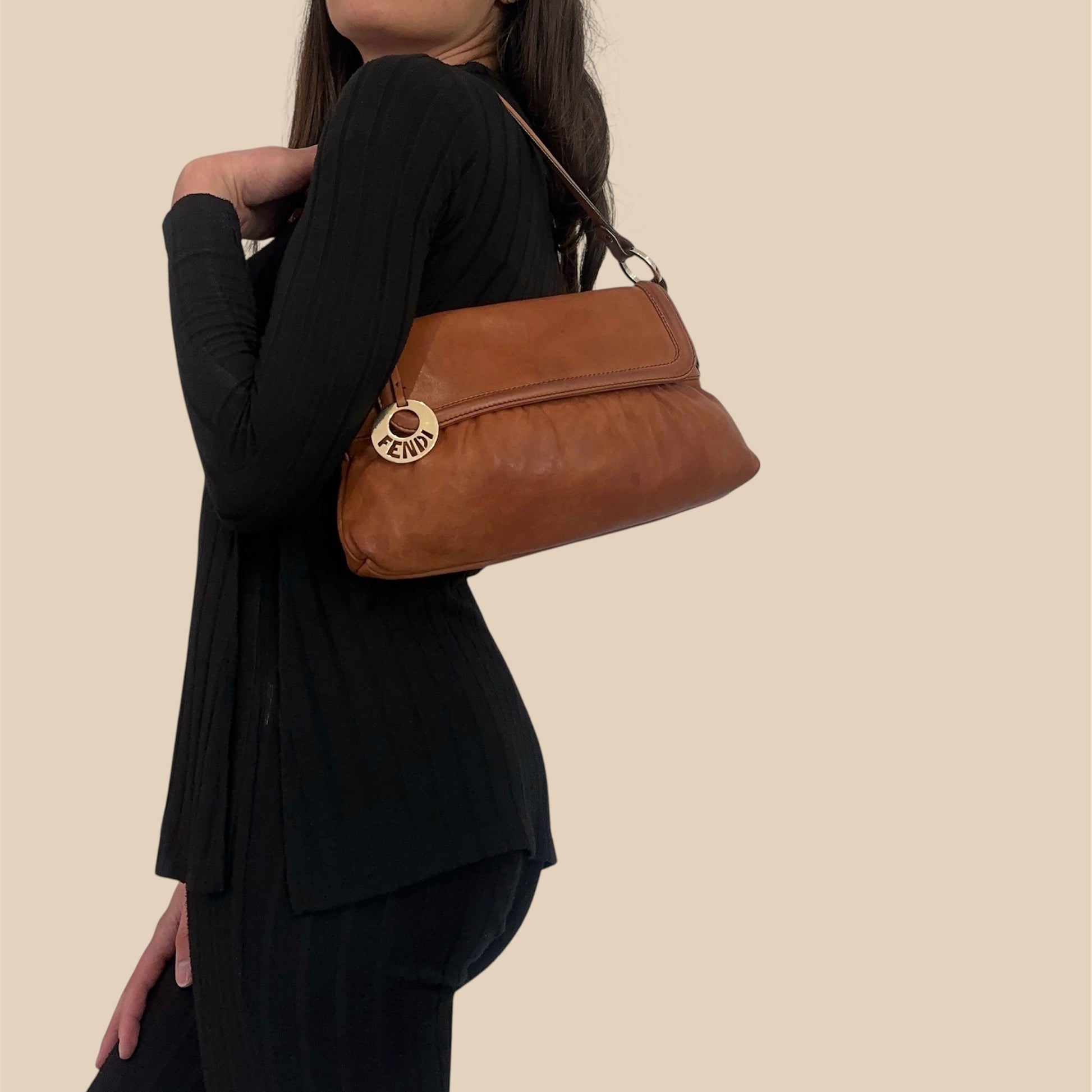 - Caratteristiche: ampio interno con chiusura a bottone a pressione, composto da 1 tasca piatta. Comodo manico per portarla a spalla. Cloche con logo Fendi