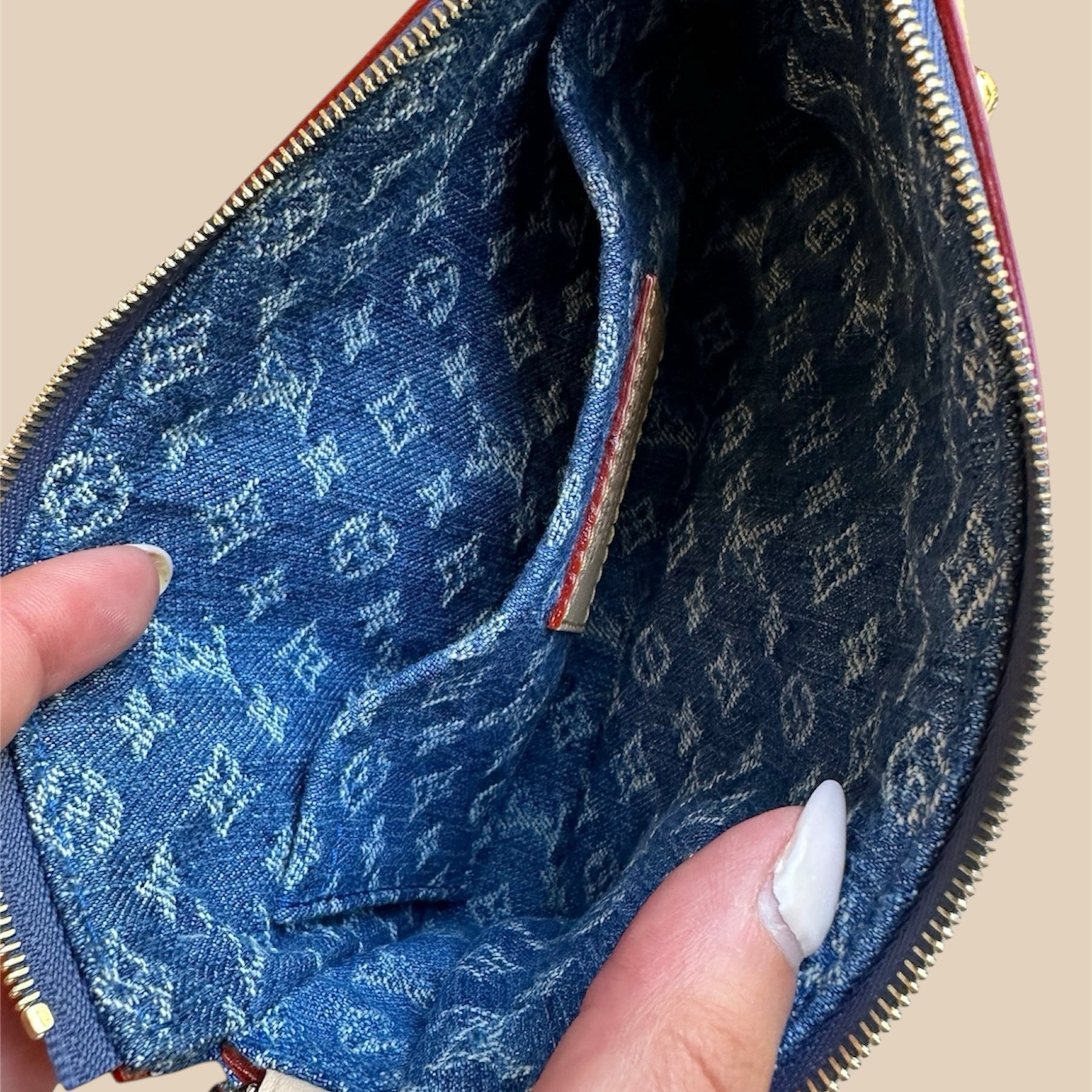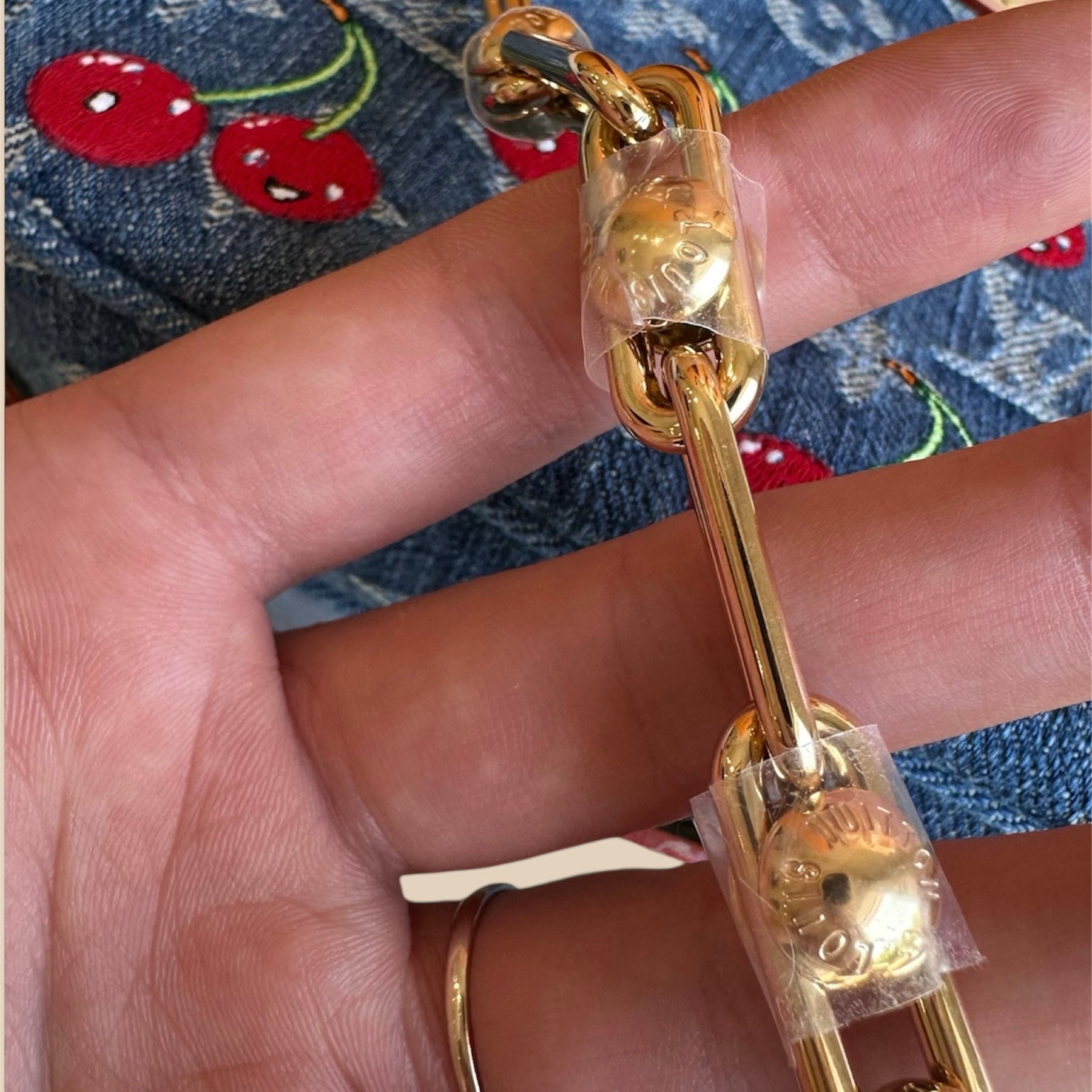 - Materiale: tela monogram in denim con ciliegie ricamate.